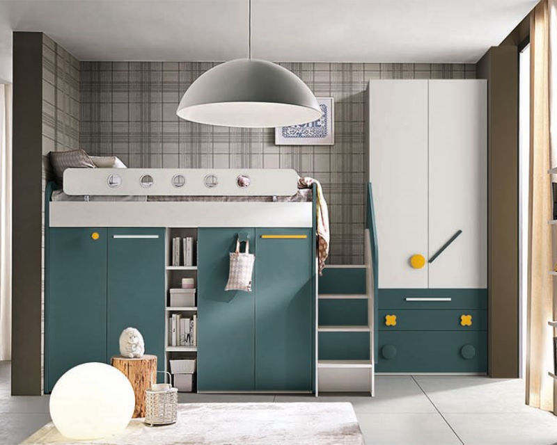 Letti a soppalco con zona studio o gioco sotto. Scrivania integrata, librerie, contenitori. Massimizzano spazio verticale.